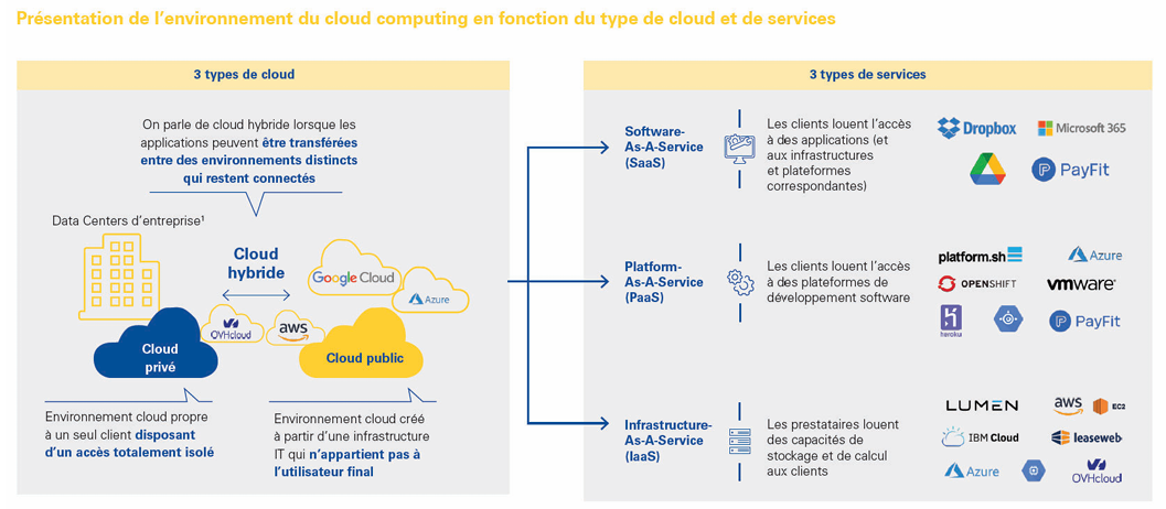 • Innovation : En externalisant l'informatique non critique, les entreprises peuvent se concentrer sur leurs compétences clés. Le cloud facilite l'expérimentation de nouvelles applications et technologies comme l'IA et le ML.